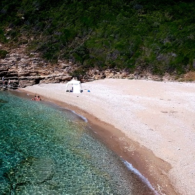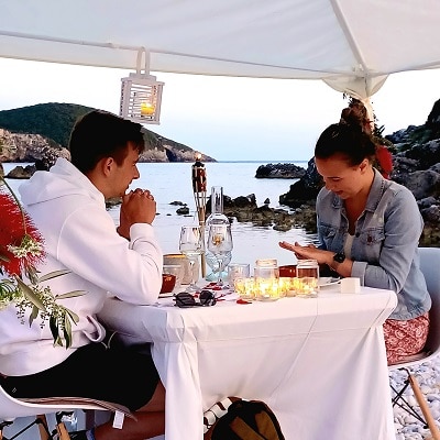 All beaches in Greece are public. Therefore, there is the risk that you will not be alone on the beach for your dinner. However, it is very likely because rental boats need to be back to the port at 18:00 and it is an hour-long hike with steep hills.
